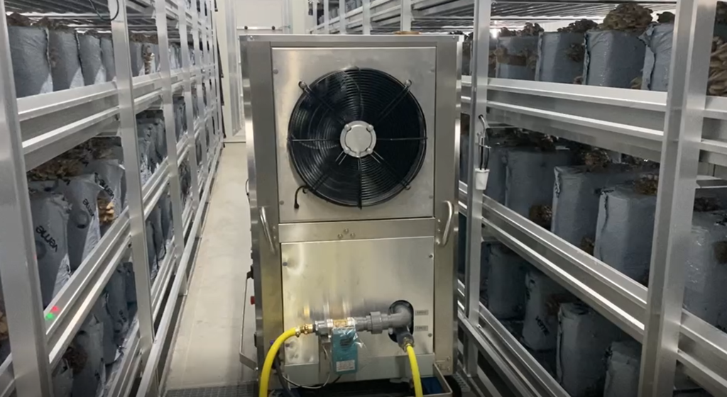 Mobile cooling machine inside mushroom grow room